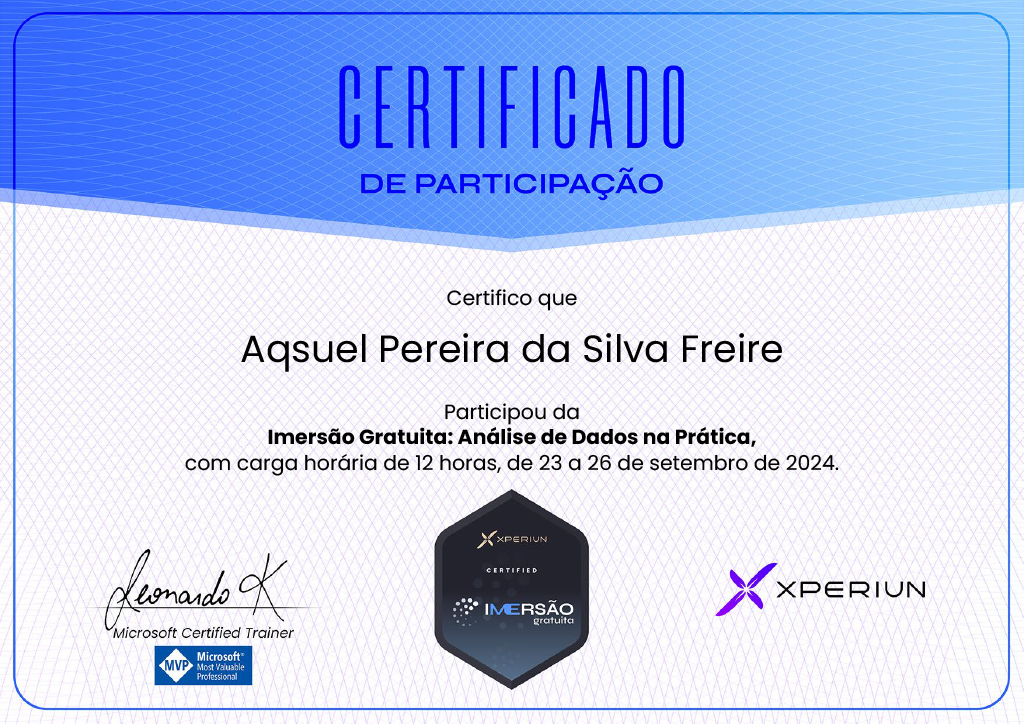 Participação no evento Análise de Dados na Prática pela Xperiun, um treinamento prático focado no desenvolvimento de soluções de Business Intelligence ponta a ponta (E2E). O projeto abordou o ciclo de vida completo dos dados, incluindo:
