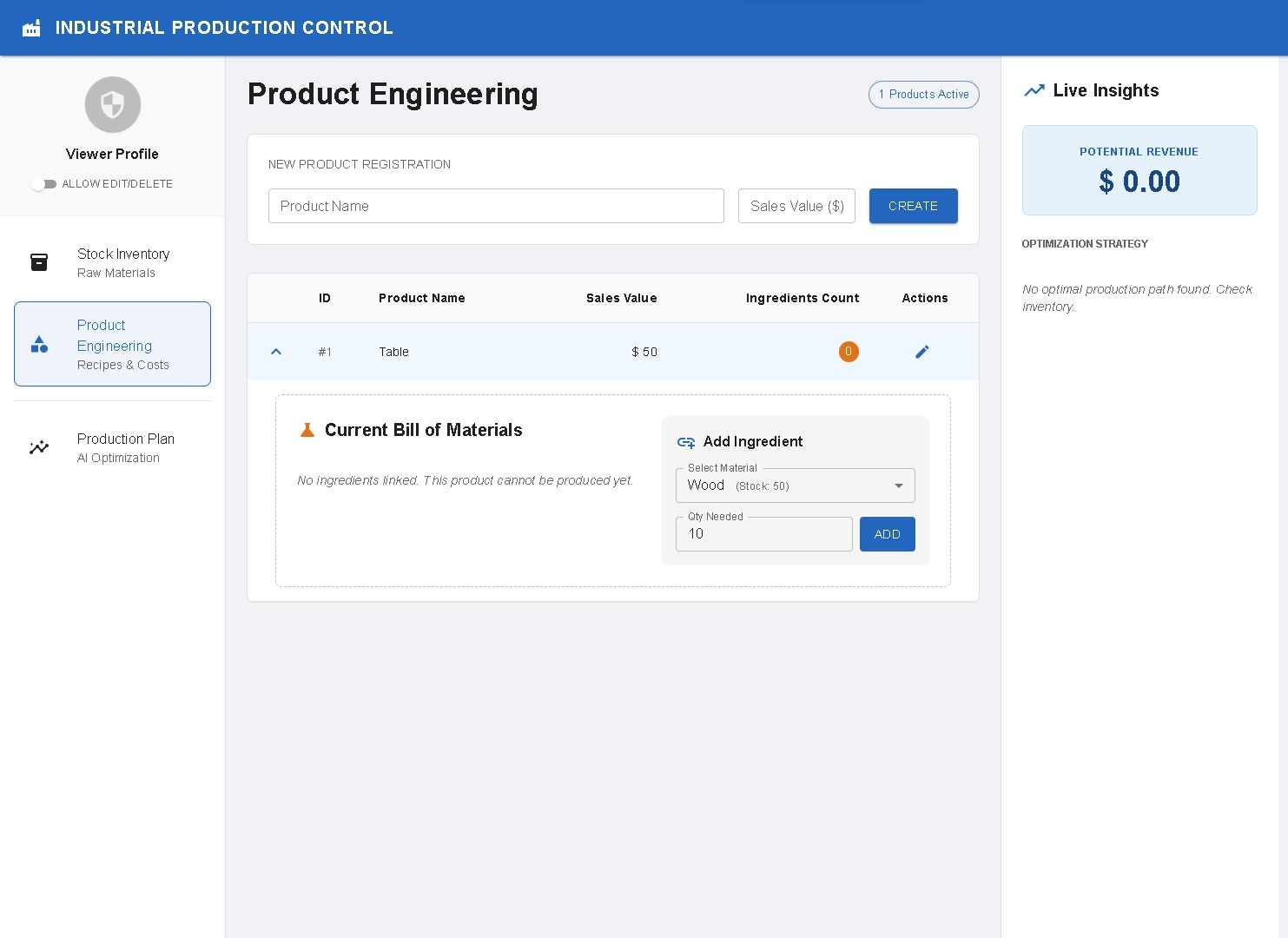 Sistema para o controle de estoque de matérias primas e produtos em uma indústria.